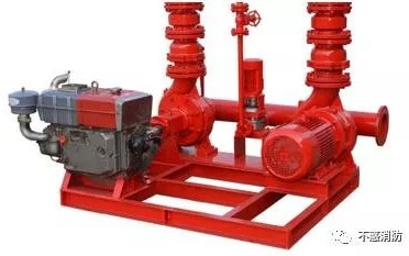 理论上双动力源可以有三种做法:(一)两台电动机分别带两台水泵,互为备用,而两台电动机的供电来自不同的电源回路;(二)两个动力源(可以是电动机也可以是内燃机)通过一个机械轴来驱动同一台水泵,这种方式由于不是很可靠,水消规做出了不应采用的规定;(三)一台电动机和一台内燃机各自带一台水泵,互为备用,如下图所示。