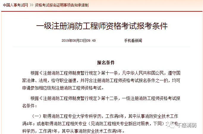 中国人事考试网于2019年8月23日上午发布了《一级注册消防工程师资格考试报考条件》,和往年差别不大。